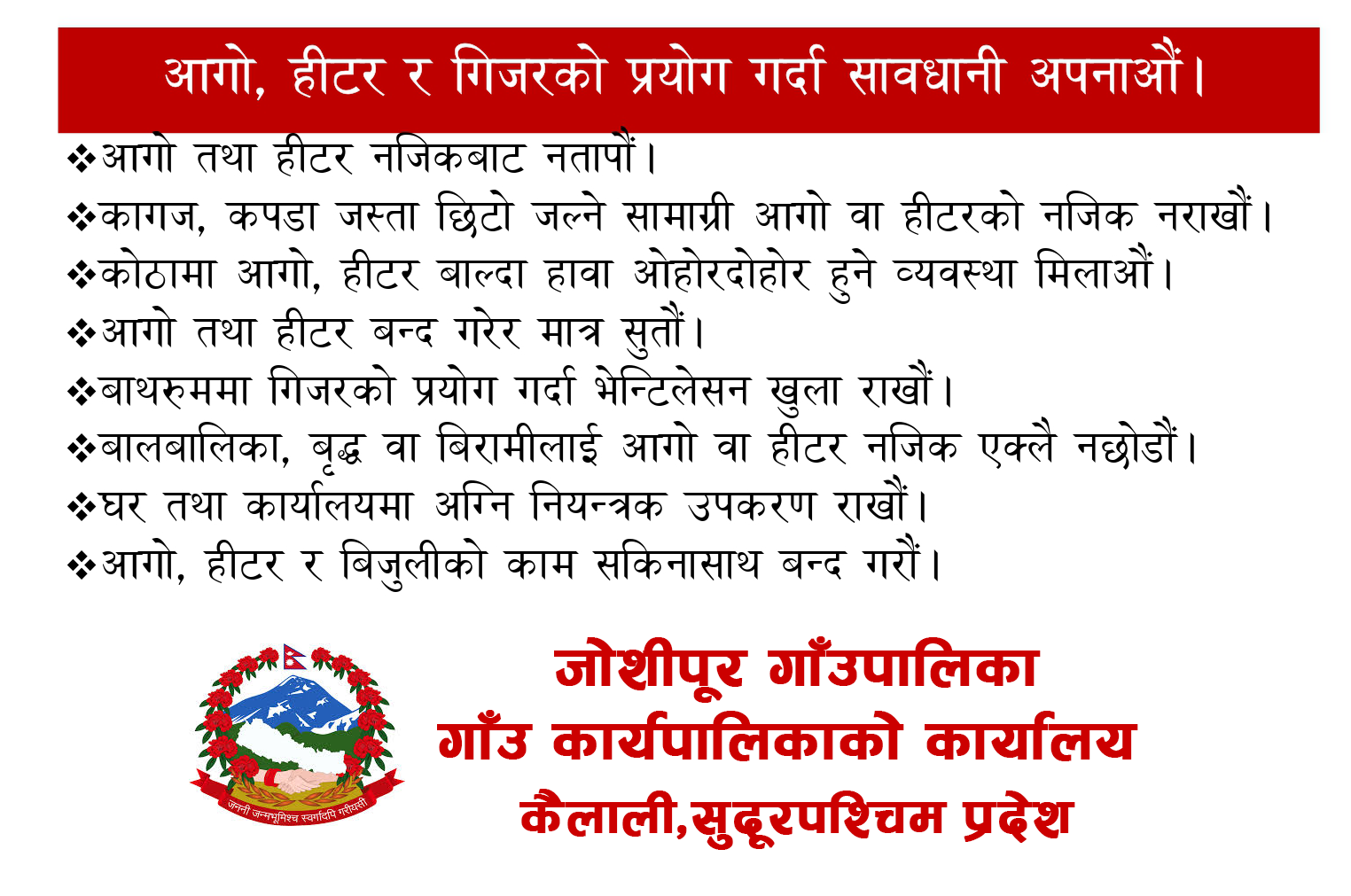 “हिउँदमा घाम लागेको दिनमा पनि यहाँ निकै चिसो हुन्छ । अहिले परेको हिमपातले विद्यालय पूरै ढाकिएको छ । यस्तो अवस्थामा बालबालिकालाई चिसोबाट जोगाउन चुनौती भएको छ,” रावतले भन्नुभयो ।